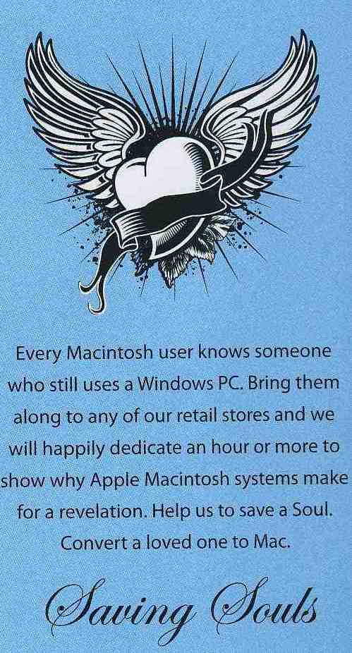 in case you’re concerned about what on earth has caused this drivel, its catalyst was the rather extraordinary advert for solutions inc. on the back of this month’s MacFormat magazine (see closeup, up and full ad, right). I knew Macs were good (and i do have to say that i enjoy using mine far more than i ever did my PC) – but i suspect that the claims for their efficacy slightly exceed reality. Perhaps the Advertising Standards Agency should be informed – i mean what evidence can they actually provide that Macs do save souls?