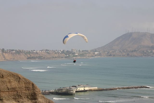 miraflores-beach-lima-03.jpgThen yesterday, the lure of the Pacific, with its paragliders and Sunday afternoon strollers. Out in the bay, in the far distance, was an island on which an Alcatraz-type prison stands. It is notable for being the location of the subterranean incarceration of Ă“scar RamĂ­rez, former leader of the communist Shining Path (and thus a reminder of Peru’s less happy side). Still, the sea breeze was a tonic in what can be a rather stultifying and polluted Lima atmosphere.