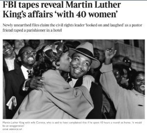 Today’s Sunday Times contained a terrible report on the FBI’s recently released files on Martin Luther King Jr. by Tony Allen-Mills. Even before the domino-effect exposures of the #MeToo phenomenon, it would have been a stretch to dismiss some of the findings as, say, the harmless indulgences of a man under intolerable stresses needing to let off steam.