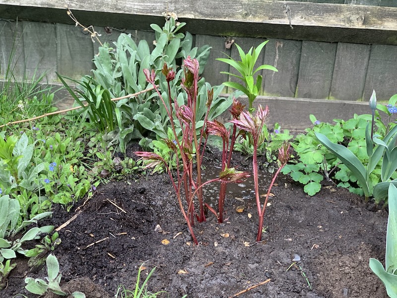 Mark says: We had a lovely surprise a while back when a mutual friend who used to visit Frances weekly after she had moved out of London said that she wanted us to have a plant from her garden. So, in early April 2021, we planted this Peony in one of our beds. We don’t have great green-fingered credentials but so far so good: it still looks alive!