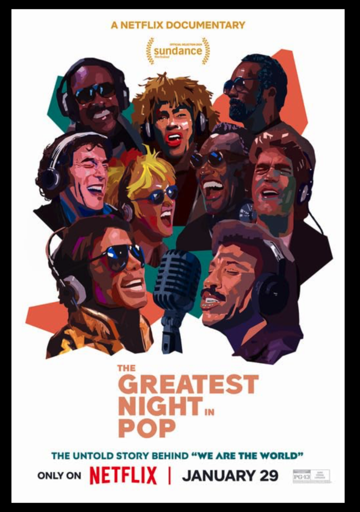 The Greatest Night in Pop is a Netflix documentary (2024, dir by Bao Nguyen) about the single night during which the charity single We Are The World was recorded. The song was written by Lionel Richie and Michael Jackson, and produced by Quincy Jones and Michael Omartian.